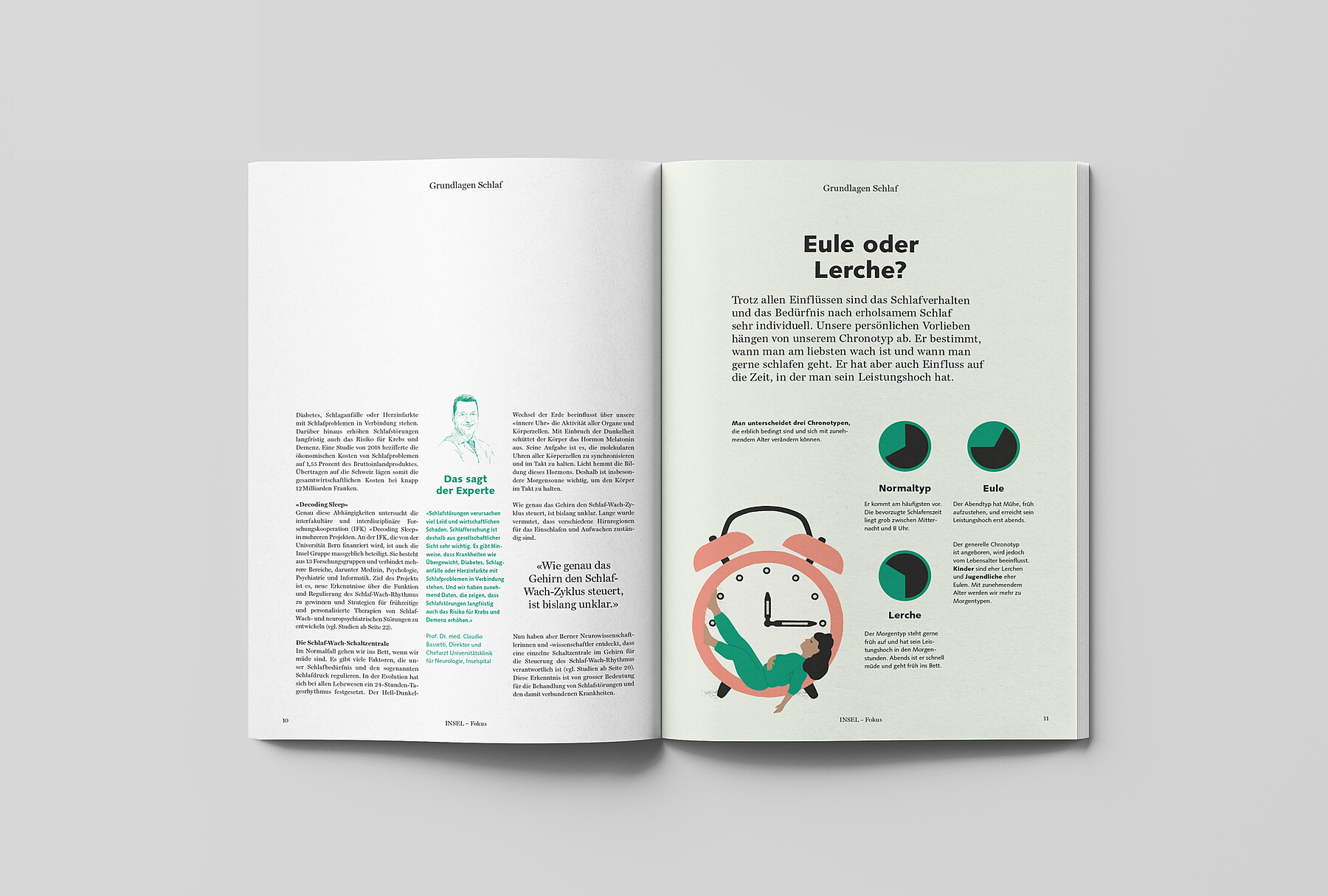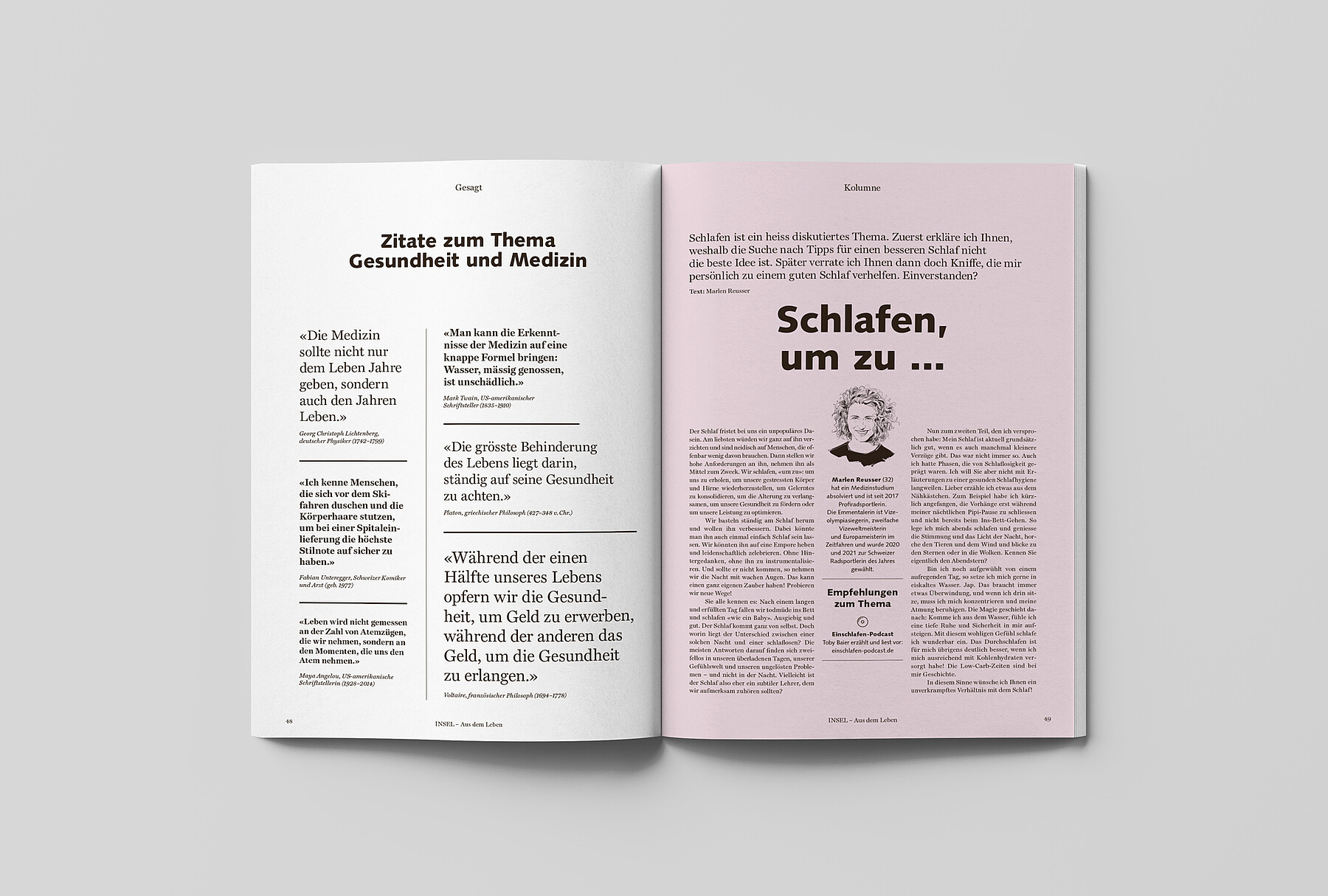 Die zwei Magazine «VITA» und «Gesundheit» wurden zu einer neuen Publikation vereint. Stämpfli Kommunikation hat dafür ein detailliertes Gesamtkonzept zu Inhaltsaufbau, Design und Distribution entwickelt. Das Gesundheitsmagazin «INSEL» erscheint zweimal jährlich in gedruckter Form. Es wird der «BZ»/«Bund»-Gesamtausgabe und dem «Bieler Tagblatt» beigelegt und schlägt die Brücke zwischen der Insel Gruppe, den Stadt- und Landspitälern, deren Mitarbeitenden und den Lesenden.