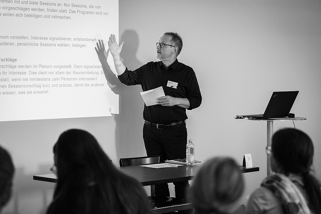 Um eine Session anzubieten, reicht es aus, eine Thematik oder eine Frage zu formulieren, zu der man sich mit anderen austauschen möchte. Man stellt sein Thema zu Beginn im Plenum vor und führt dann die Session durch.
